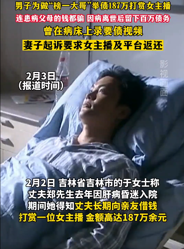吉林省吉林市的丈夫郑先生因肝病昏迷入院。妻子于女士四处奔走,正为医疗费头疼的时候,一查丈夫的手机账单,得到了一个晴天霹雳:原来,丈夫曾经长期向亲友借钱,来打赏一位女主播。为做“榜一大哥”,丈夫借钱金额竟高达187万余元。