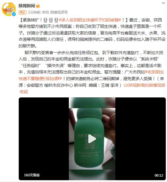 最近,安徽、陕西等多地警方接到不少市民报案:称自己收到了陌生快递,快递盒子里面是一个杯子。诈骗分子通过非法渠道获取大家的信息,冒充电商平台客服送大米、水果、洗衣液等用品骗取人们信任,诱导扫描其提供的二维码,扫码后便会加入骗子所开设的聊天群。