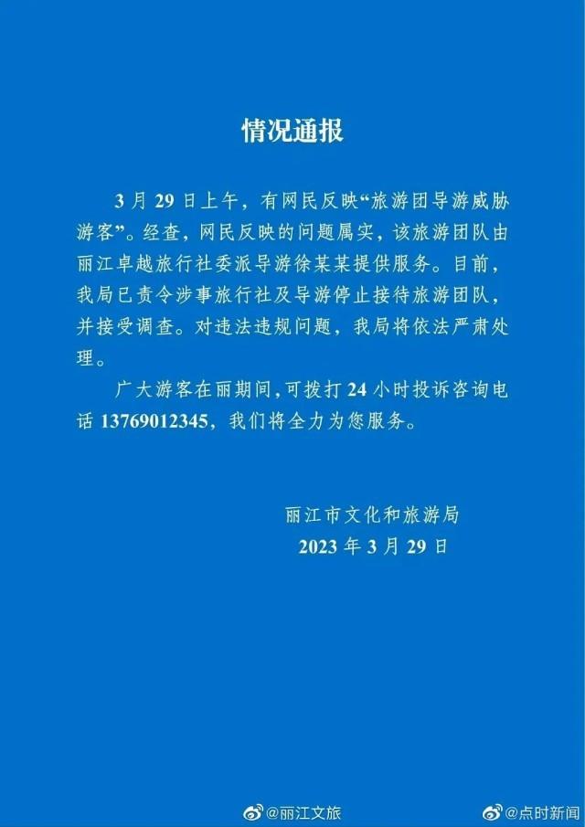 丽江市文旅局工作人员告诉极目新闻记者,他们已经关注到此事,目前正在核实调查阶段,等调查结果出来后,会及时对外通报。