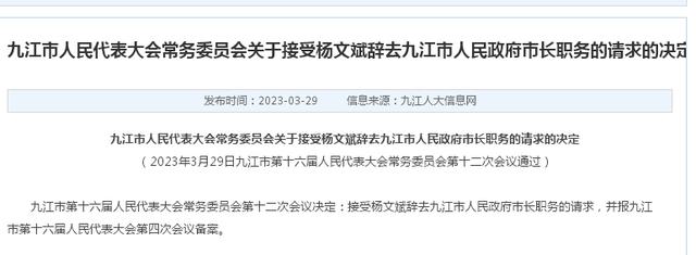 江西省九江市人民代表大会常务委员会3月29日发布消息称,九江市第十六届人民代表大会常务委员会第十二次会议决定:接受杨文斌辞去九江市人民政府市长职务的请求,并报九江市第十六届人民代表大会第四次会议备案。