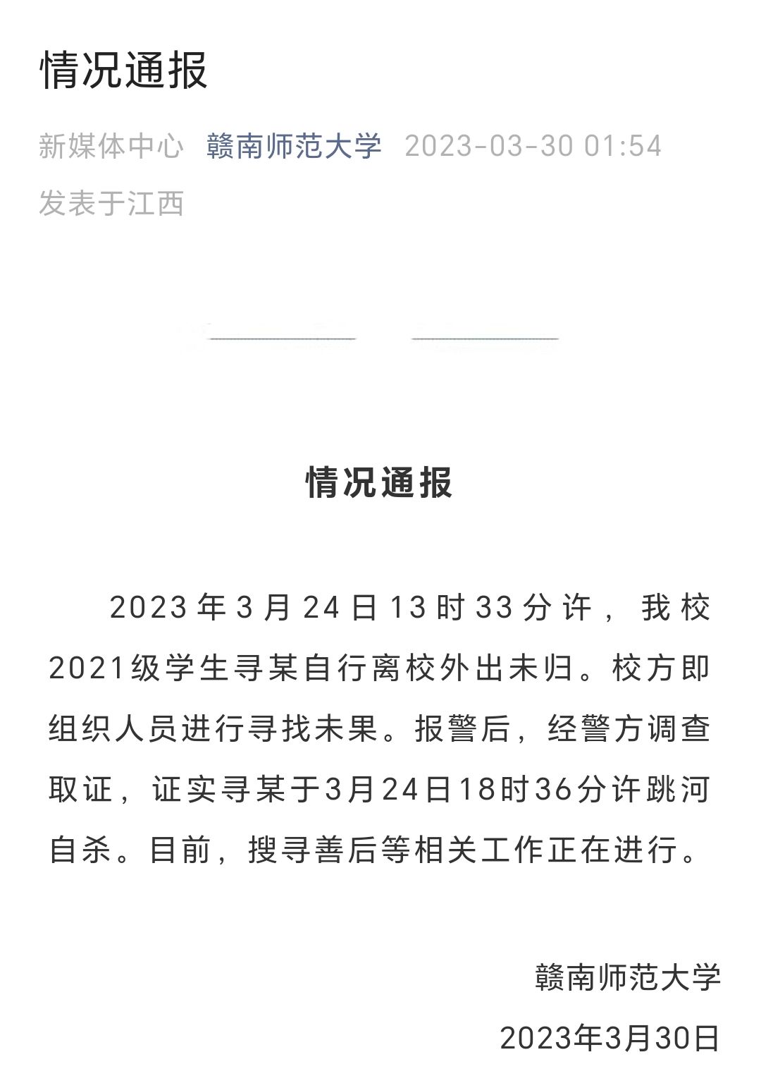 近日,赣南师范大学一女大学生寻某失踪引发关注。3月30日凌晨1:54分,赣南师范大学微信公众号发布《情况通报》称:2024年3月24日13时33分许,学校2021级学生寻某自行离校外出未归。校方即组织人员进行寻找未果。报警后,经警方调查取证,证实寻某于3月24日18时36分许跳河自杀。目前,搜寻善后等相关工作正在进行。