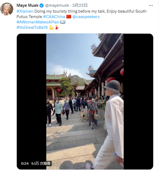 梅耶·马斯克于3月18日发推称自己将开启中国之行,表示自己将来中国宣传新书并游玩。3月22日,她晒图称自己在广州度过“美好的一天”;23日,她又发视频称自己在厦门欣赏了美丽的南普陀寺;她25日还发自己去了特斯拉成都门店的照片。