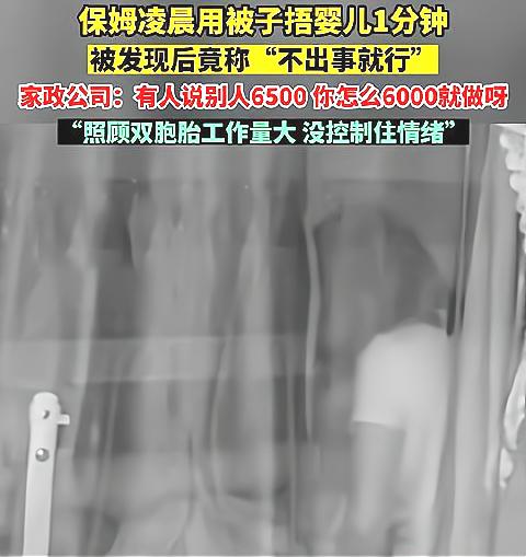 近日在东莞发生了一起保姆凌晨用被子捂婴儿头部的事件。据报道,当时保姆凌晨3点哄孩子睡,由于失去耐心,用棉被盖住婴儿头部长达1分钟,期间宝宝一直挣扎。事件被家长发现后,保姆称“不出事就行了”。家政公司回应称,保姆可能因带双胞胎工作量大。目前当地警方已介入该案件。