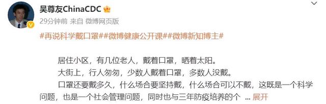 4月2日,中国疾控中心流行病学首席专家吴尊友就“口罩还要戴多久,什么场合要坚持戴,什么场合可以不戴”等问题在其微博发文。