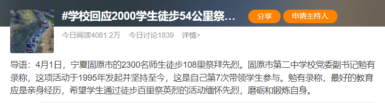 近日,一学校学生徒步54公里祭奠英烈话题火了,因如此长的距离让不少网友惊呼这才是真正的教育从娃娃抓起的最真实,最有意义的体现。据梨视频发布消息:
