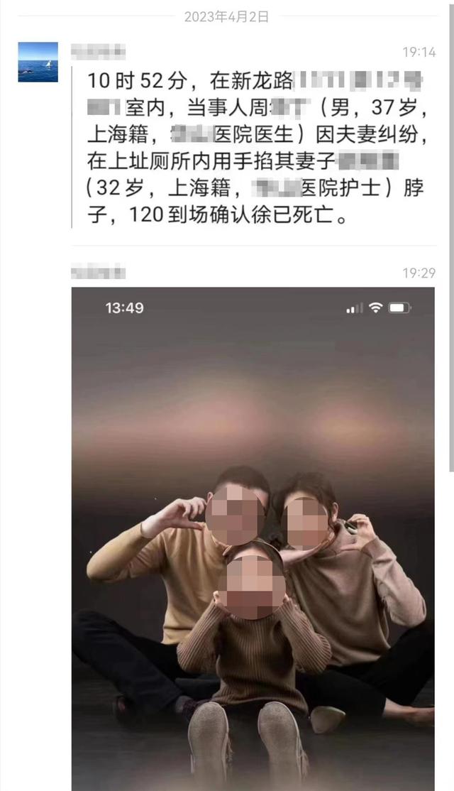 4月3日,上海市公安局闵行分局官方发布了一则警情通报:2024年4月1日10时50分,新龙路某小区内发生一起刑事案件,民警迅速到场将犯罪嫌疑人周某某(男,37岁)控制。经查,周某某因家庭矛盾与妻子徐某某发生冲突后,将徐某某杀害。目前,周某某已被依法刑事拘留,案件正在进一步侦办中。