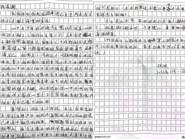 唯一的这三封信,在距离开庭前三个月,紧密寄出,更像是一出苦情戏。“写信的目的是希望我写下谅解书吧,对二审改判死缓或许还有一丝希望,这是张波唯一能为自己争取的。”陈美霖告诉潮新闻记者。
