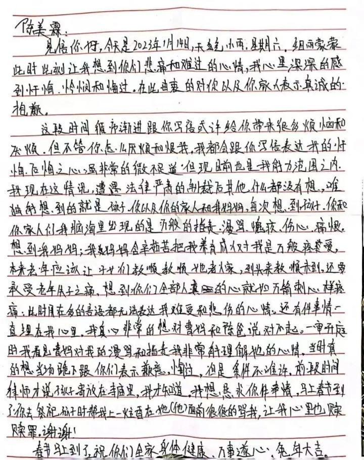 张波在信里满篇幅请求原谅。但让陈美霖和家人觉得奇怪的是,关于过错,张波只提到一句“罪大恶极”,并没有承认自己错在哪里。