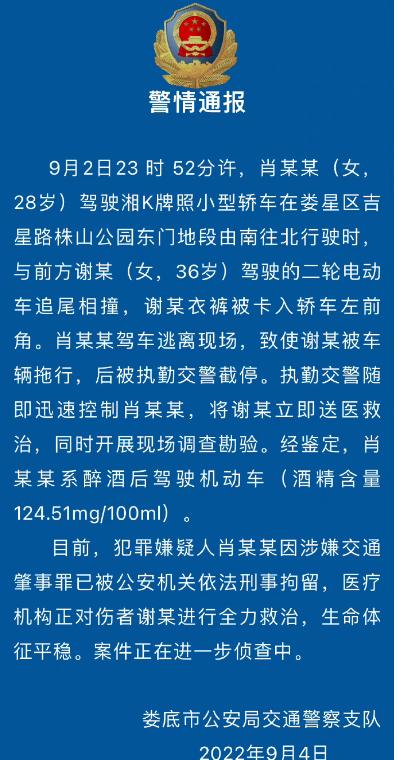 据警方通报,该事件发生于2024年9月2日晚,当时肖某某(女,28岁)驾驶湘K牌照小型轿车在娄星区吉星路株山公园东门地段由南往北行驶时,与前方的谢某(女,36岁)驾驶的电动车追尾相撞,导致谢某被卡在轿车左前角,随后肖某某驾车逃逸,致使谢某被车辆拖行。后来,执勤交警将肖某某控制,将谢某立即送医救治,并对事故现场进行勘验。经鉴定,肖某某当时酒驾且酒精含量达到124.51mg/100ml。