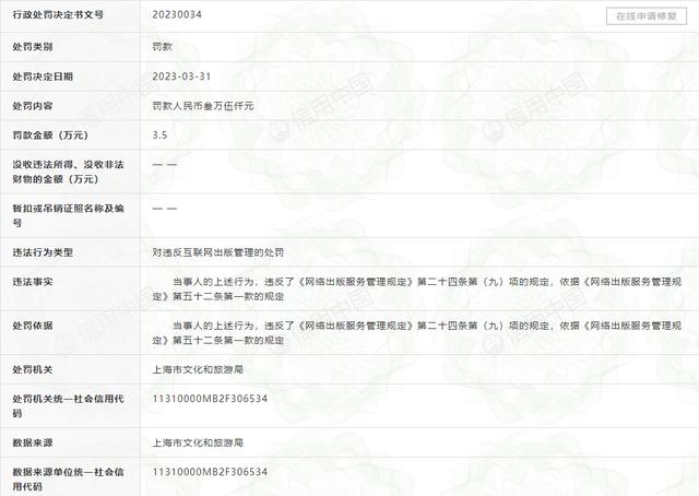 信用中国网站显示,小红书关联公司行吟信息科技(上海)有限公司因违反《网络出版服务管理规定》第二十四条第(九)项规定,被上海市文化和旅游局罚款3.5万元。上述规定内容为:网络出版物不得含有危害社会公德或者民族优秀文化传统的内容。