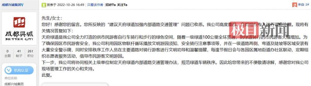 极目新闻记者注意到,针对网友的反映,去年10月,成都天府绿道建设投资集团有限公司母公司成都兴城集团在回复中称,为了确保园区市民游客安全,该公司利用园区物联杆循环播放文明游园须知、安全骑行注意事项等,并在一级道路两侧、弯道及陡坡等区域安装有大量安全警示牌……此外,回复中还提到“公司将协同相关上级单位制定天府绿道内部道路交通管理办法”。