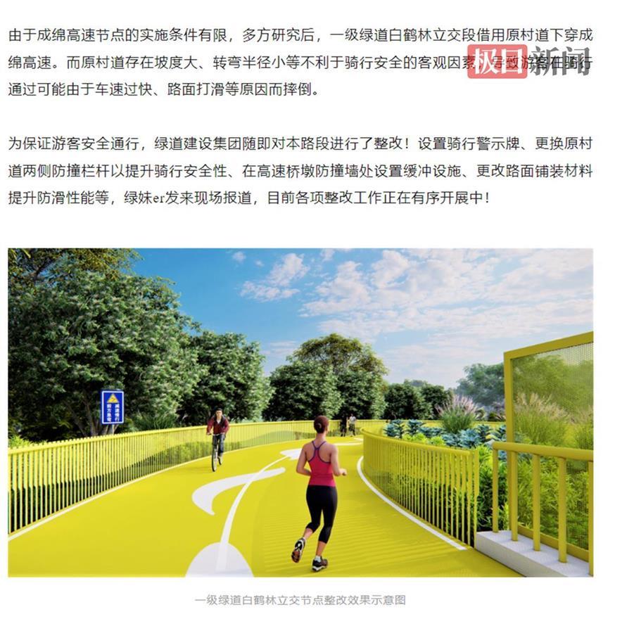 成都天府绿道建设投资集团有限公司官方微信公众号曾于2024年7月提到,一级绿道白鹤林立交段借用原村道下穿成绵高速,而原村道存在坡度大、转弯半径小等不利于骑行安全的客观因素,导致游客在骑行通过可能由于车速过快、路面打滑等原因而摔倒。为了保证游客安全通行,绿道建设集团对该路段进行了整改,措施包括设置骑行警示牌、更换原村道两侧防撞栏杆以提升骑行安全性、在高速桥墩防撞墙处设置缓冲设施、更改路面铺装材料提升防滑性能等。