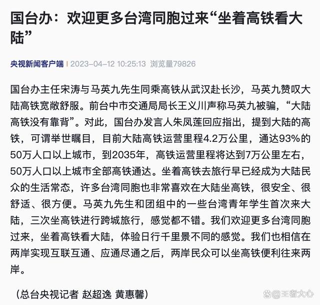 最近,一位台湾名嘴声称大陆高铁没有靠背,引起了不小的轰动。然而,国台办发言人朱凤莲对此回应说:大陆高铁已经成为了大陆民众生活的常态,运营里程已达到4.2万公里,通达93%的50万人口以上城市,而且到2035年,高铁运营里程将达到7万公里左右,50万人口以上城市全部高铁通达。这一切都说明了大陆高铁的安全性、舒适性、方便性以及受到的欢迎程度。同时,国台办也欢迎更多台湾同胞前来大陆坐高铁,感受大陆的魅力,亲身体验高铁的便利。