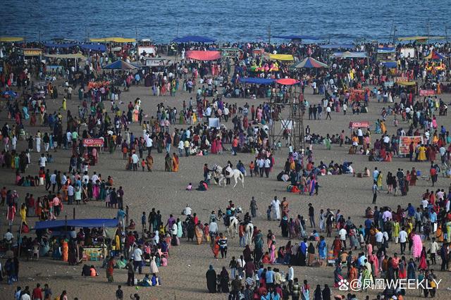 2024年1月,印度金奈,民众在海滩上庆祝丰收节。