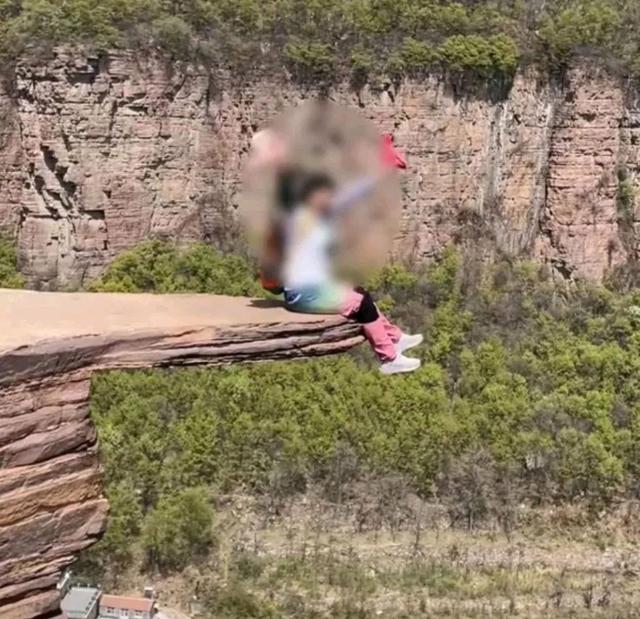 在合涧镇石板沟村,悬崖边的一块网红“试胆石”出现了裂痕,但还是有游客站上去拍照。