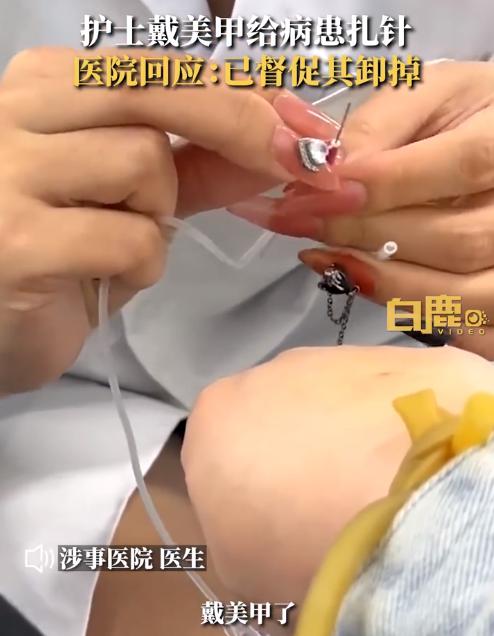 对此,医院方工作人员回应称,医院有规定护士上班时不能戴美甲,这名护士是新招的,还在试用期,已督促该护士卸掉美甲。