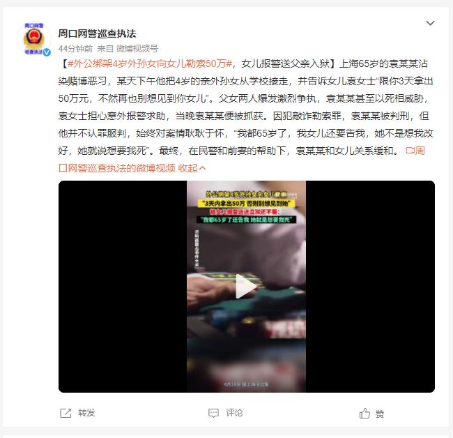 上海65岁的袁某某沾染赌博恶习,某天下午他把4岁的亲外孙女从学校接走,并告诉女儿袁女士“限你3天拿出50万元,不然再也别想见到你女儿”。父女两人爆发激烈争执,袁某某甚至以死相威胁,袁女士担心意外报警求助,当晚袁某某便被抓获。因犯敲诈勒索罪,袁某某被判刑,但他并不认罪服判,始终对案情耿耿于怀,“我都65岁了,我女儿还要告我,她不是想我改好,她就说想要我死”。最终,在民警和前妻的帮助下,袁某某和女儿关系缓和。