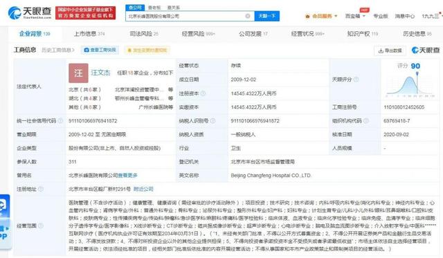天眼查显示,北京长峰医院系一家连锁医院集团,于2009年成立,后于2016年整体变更为股份有限公司,2017年在新三板挂牌上市(股票代码870890),目前公司以血管性疾病尤其是血管瘤类及脉管畸形诊疗业务为主。