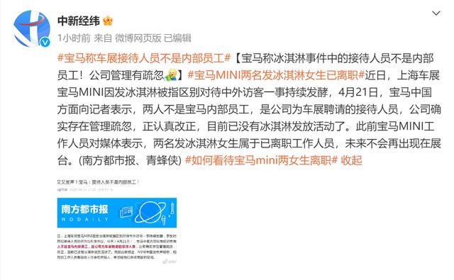 近日,上海车展宝马MINI因发冰淇淋被指区别对待中外访客一事持续发酵,4月21日,宝马中国方面向记者表示,两人不是宝马内部员工,是公司为车展聘请的接待人员,公司确实存在管理疏忽,正认真改正,目前已没有冰淇淋发放活动了。此前宝马MINI工作人员对媒体表示,两名发冰淇淋女生属于已离职工作人员,未来不会再出现在展台。