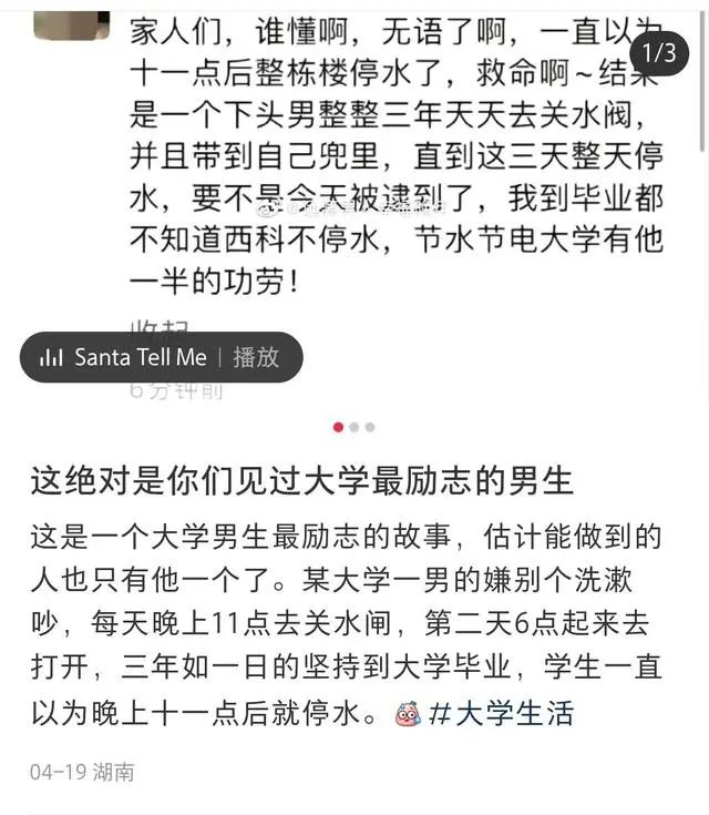 近日,有网友发帖称,西安科技大学一男生因宿舍在水房旁边,嫌晚上洗漱声太吵,每天晚上11点准时关水阀,早上6点准时开水阀,坚持了3年。