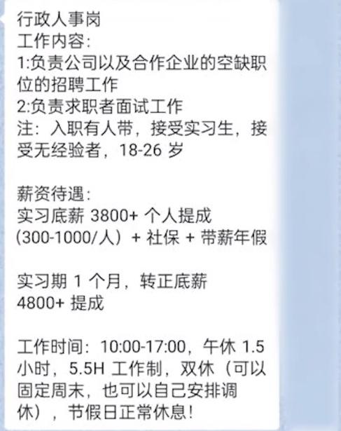 根据该女子晒出的聊天记录来看,其应聘的工作岗位为行政人事岗,实习期待遇为3800元的底薪以及300-1000元/人的个人提成。实习期为1个月,转正之后底薪变为4800元。该岗位10点上班,5点下班,且周末双休。
