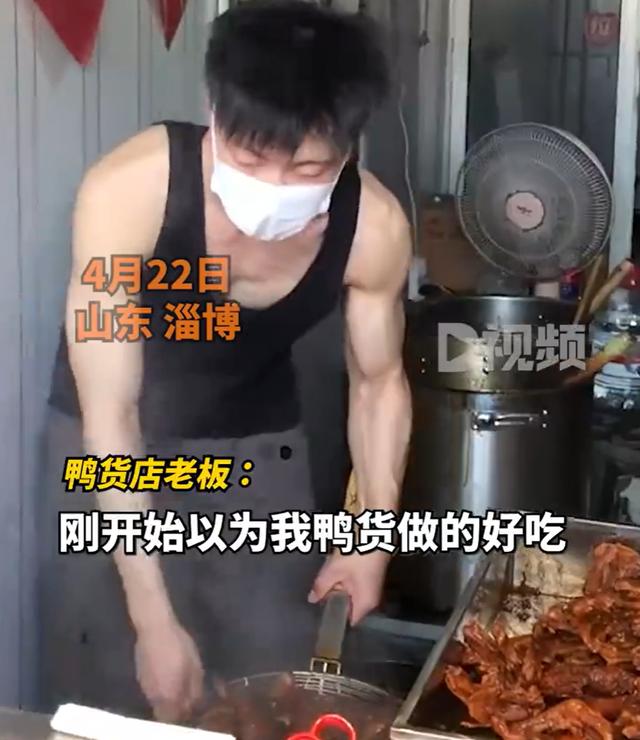 当事人伊先生介绍,他知道自己最近火了,本来以为是鸭货做的好吃,每天有很多顾客过来拍照,但自己比较社恐,不敢看顾客。“我平时没有时间健身,我每天要忙到很晚,因为我干的都是力气活,时间久了就出现‘线条’了。”