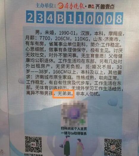 现场的嘉宾信息牌成为“红线”,牵起了前来寻缘的单身嘉宾。记者注意到,要求女方不能有弟弟,成为不少男生的择偶条件之一。