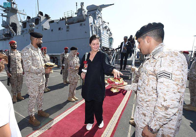 撤离人员通过陆路转海路的方式成功抵达沙特,他们走下甲板时受到当地热情欢迎。