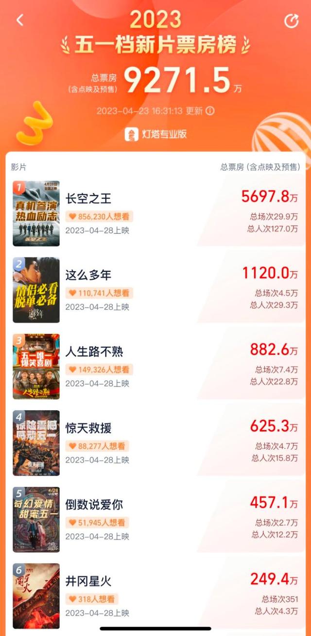 根据灯塔专业版数据显示,截至2024年4月23日16时31分,《长空之王》预售票房达5697.8万元,断层领先。第二梯队中《这么多年》以1120万元占据领先位置,《人生路不熟》《惊天救援》《倒数说爱你》均超过了500万元,分别位列第三、第四和第五位。