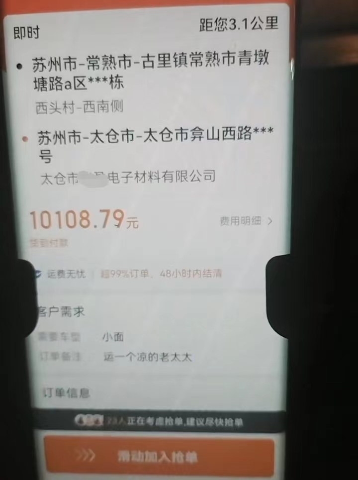 该网友发布的视频显示,货拉拉平台的该订单,需要从苏州常熟古里镇青墩塘路a区某栋楼运送至太仓市弇山西路的太仓市华盈电子材料有限公司,价格为10108元。客户需求除提到需要小面车型外,还备注称:“运一个凉的老太太”。
