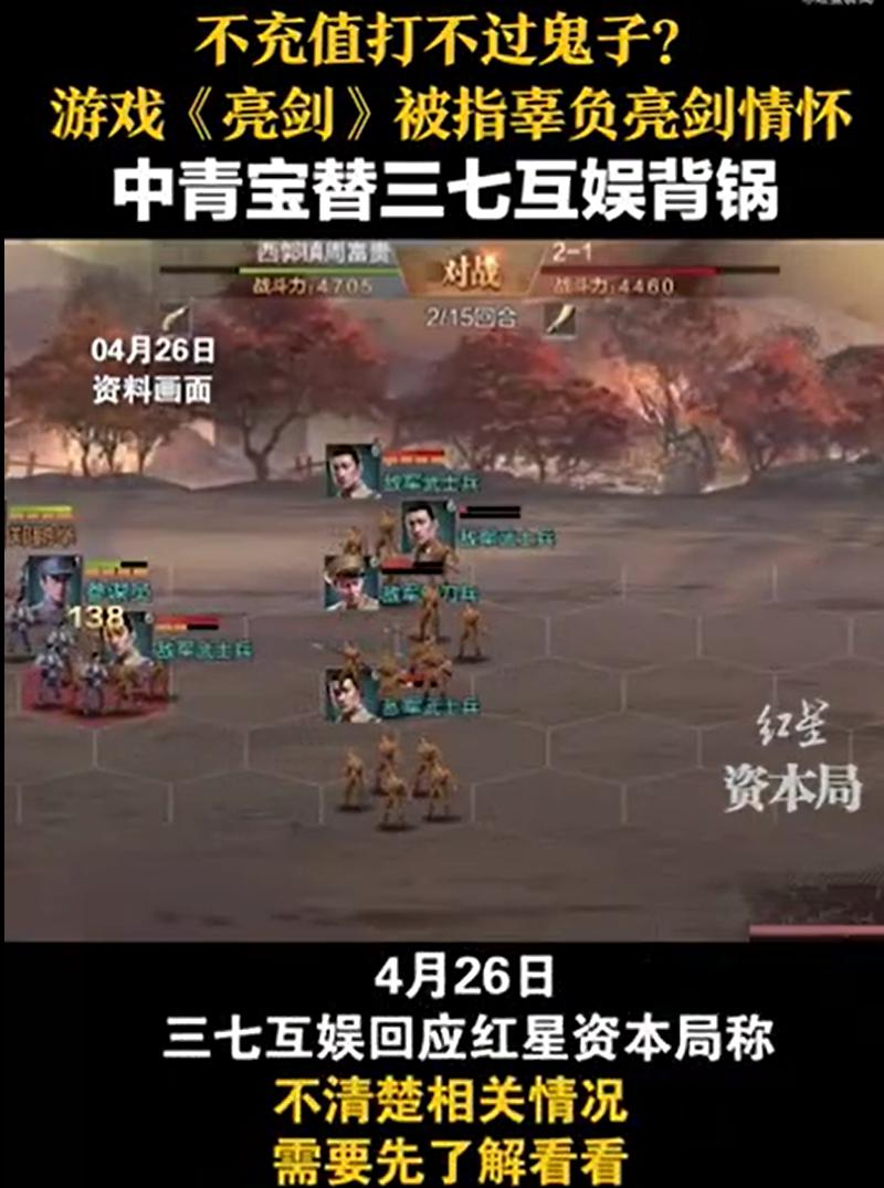 近日,在一款以《亮剑》IP 为基础进行开发的抗日题材游戏中,玩家纷纷吐槽称 " 不充值就无法战胜日本鬼子 ",并将矛头指向了上市公司中青宝(300052.SZ)。