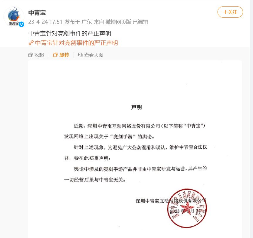 对此,中青宝 4 月 24 日发微博辟谣称,近期,深圳中青宝互动网络股份有限公司《以下简称 " 中青宝 " ) 发现网络上出现关于 " 亮剑手游 " 的舆论。