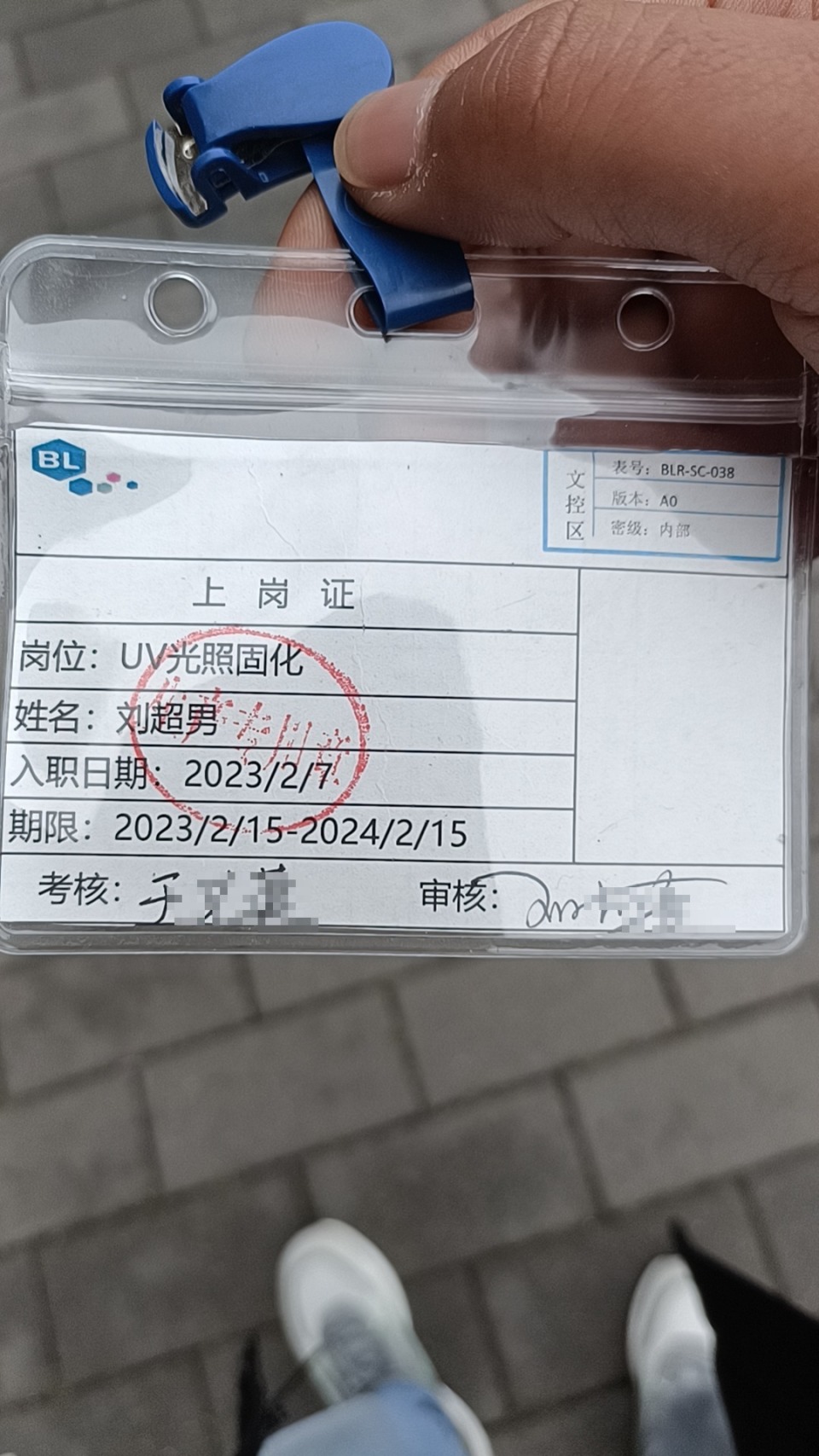 刘超男来这里打工,是通过劳务派遣的形式,与她签订合同的是实际是安徽林威德人力资源有限公司。上岗证显示,她的工种是“ UV光照固化”。