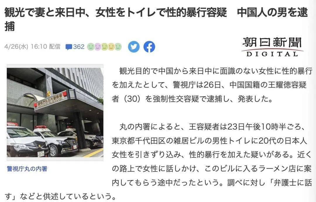根据日本新闻报道,今日一名中国访日游客王耀德(30岁)遭日本警方逮捕,据了解他于23日晚10时30分左右,将一名20多岁的日本女性拖入东京都千代田区一栋公寓大楼的男厕所,涉嫌性侵。