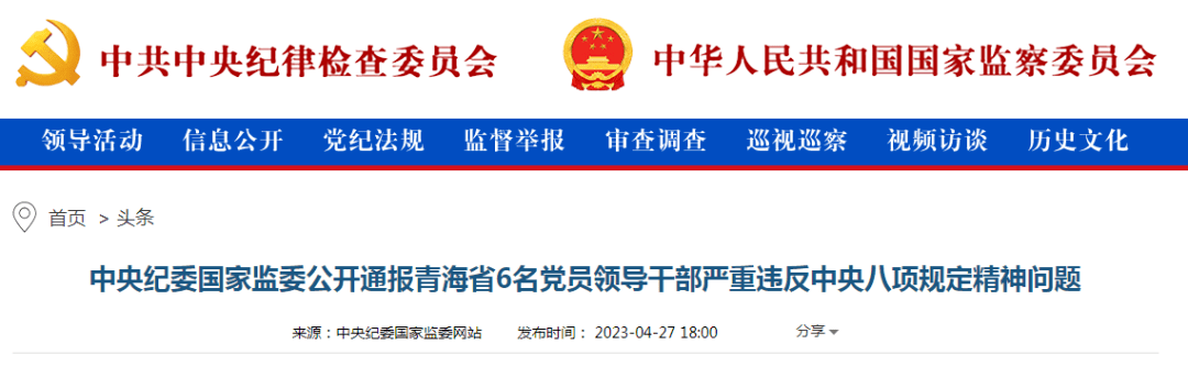 4月27日,中央纪委国家监委网站发布消息,日前,中央纪委国家监委提级审查调查并指导青海省纪委监委,严肃查处并公开通报了青海省6名党员领导干部在参加青海省党政主要领导干部学习贯彻党的二十大精神培训班期间严重违反中央八项规定精神问题。