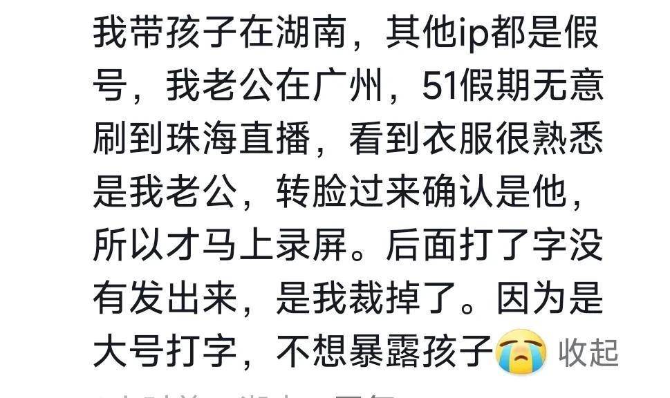 因为事情太过巧合,很多网友怀疑是剧本,女子表明自己不是剧本,也不卖货,她说她和孩子在湖南,老公在广州,当天她是无意刷到直播,看到衣服很熟悉,转脸过来确认是她老公就录屏了!