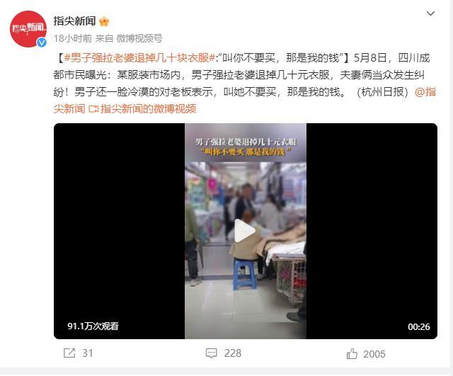 男子强拉老婆退掉几十元衣服