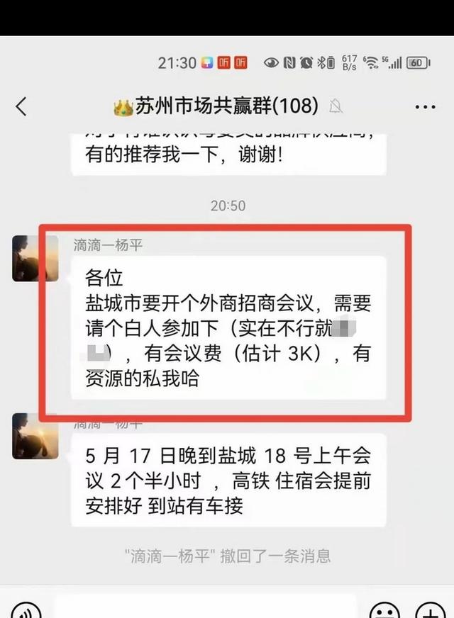 稍早前流传的一张截图显示,在一个名为“苏州市场共赢群”的微信群中,有成员发言称,各位,盐城市要开个外商招商会议,需要请个白人参加下,有会议费(估计3K),有资源的私我哈。