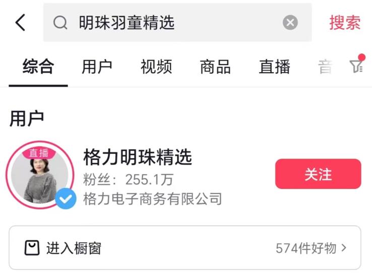 记者在短视频直播平台上,搜索“明珠羽童精选”时,仅出现一条用户名为“格力明珠精选”的直播间。同时该直播间的头像也从董明珠与孟羽童的合照变成董明珠一人。