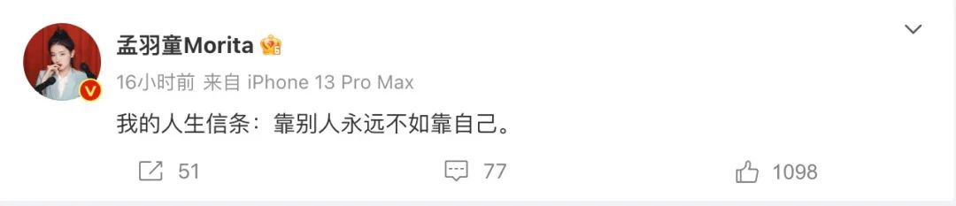 5月9日,孟羽童在微博发文称:“我的人生信条:靠别人永远不如靠自己。”目前,该微博已被删除。
