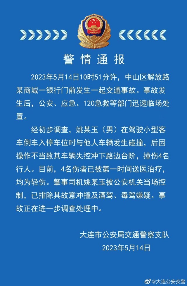 5月14日10时51分许,大连中山区解放路某商城一银行门前发生一起交通事故。经初步调查,姚某玉(男)在驾驶小型客车倒车入停车位时与他人车辆发生碰撞,后因操作不当致其车辆失控冲下路边台阶,撞伤4名行人。目前,4名伤者已被第一时间送医治疗,均为轻伤。肇事司机姚某玉被公安机关当场控制,已排除其故意冲撞及酒驾、毒驾嫌疑。事故正在进一步调查处理中。