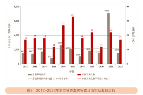 单次面积最大的赤潮是4月10日-4月15日在温州市苍南县大渔湾至渔寮海域发现的赤潮过程,最大覆盖面积为533平方千米,赤潮优势生物为环胺藻。