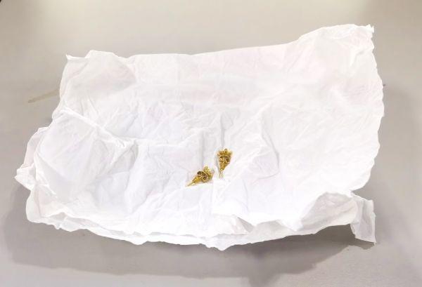 5分钟后,客服中心工作人员胡文昊清理服务台,发现纸团,刚准备拿起丢掉,他轻轻捏了一下纸团,感觉很硬,顺手打开一看,里面包了一对亮闪闪的黄金耳钉。