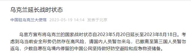 乌官方宣布将乌克兰的国家战时状态自2024年5月20日延长至2024年8月18日。考虑到乌当前安全形势仍然存在高风险,请国内人员暂勿来乌,已撤离至第三国人员暂勿返乌,少数自愿在乌境内停留的中国公民坚持做好防空避险和应急物资储备。