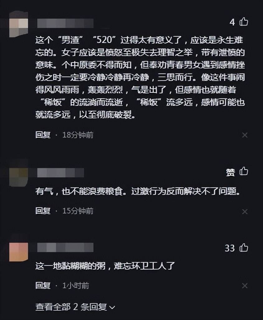 也有网友说:“用粮食泼渣男不仅仅是一种浪费,更是一种奢侈!其实可以换个不浪费粮食的东西”“是不是因为这个男子喝粥没给钱?”