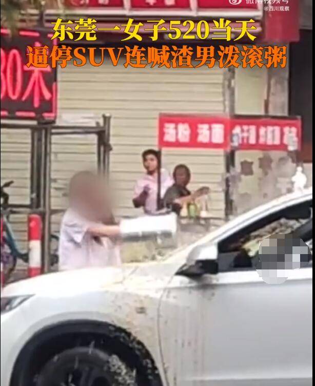 2024年5月20日,一个普通的星期六,但是由于谐音梗的原因,但是在这个“不平常”的日子里发生了一些看起来就不怎么平常的事情,比如说在广东东莞,一女子将路边摊贩的3桶热粥泼在白车身上一边泼一边喊“渣男”拍摄者:她把车逼停先砸后泼,而男车主在一边看着。