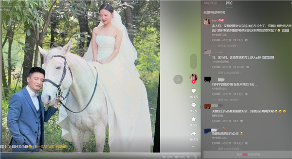 意外登上热搜后,当事女主更新视频回应表示,婚纱照还没修出来,只能看电脑上的。马儿的名字叫大青,今年16岁,真的很可爱,我俩都很喜欢。