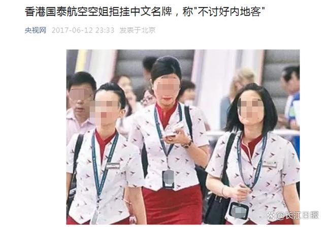 据海外网当时报道,香港国泰航空于5月底对外宣布,欲将香港及台湾空中服务员挂在胸口的名牌,从原来的只有英文名改为中英文名对照。此事引来国泰员工强烈反对,他们担心在服务过程中如果出现不愉快的情况,有人可能会根据名牌上的中文名字追查自己的身份,或会对其私人生活造成滋扰。更有甚者,直斥这项决策有“讨好内地客”之嫌。事件最终以国泰航空搁置计划而暂告一段落。