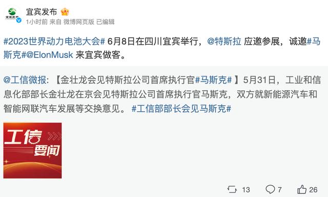 2023世界动力电池大会将于6月8日在四川宜宾举行,特斯拉应邀参展。正当马斯克访华之际,5月31日,宜宾发布官方微博发文,诚邀马斯克来宜宾做客。