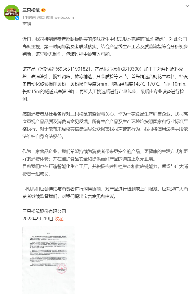 9月19日晚,三只松鼠官微发布声明称,对于该事件,公司高度重视,第一时间与消费者联系核实。结合产品线生产工艺及质监流程综合分析初步判断,该异物无制作、包装过程中被带入可能。